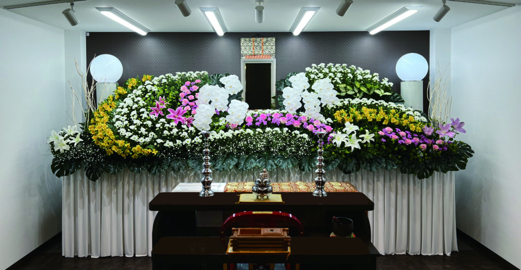 当社の葬儀はお花に包まれた心のこもった祭壇をご用意し、故人様ご家族の想いを大切にたくさんのお花を飾ります。